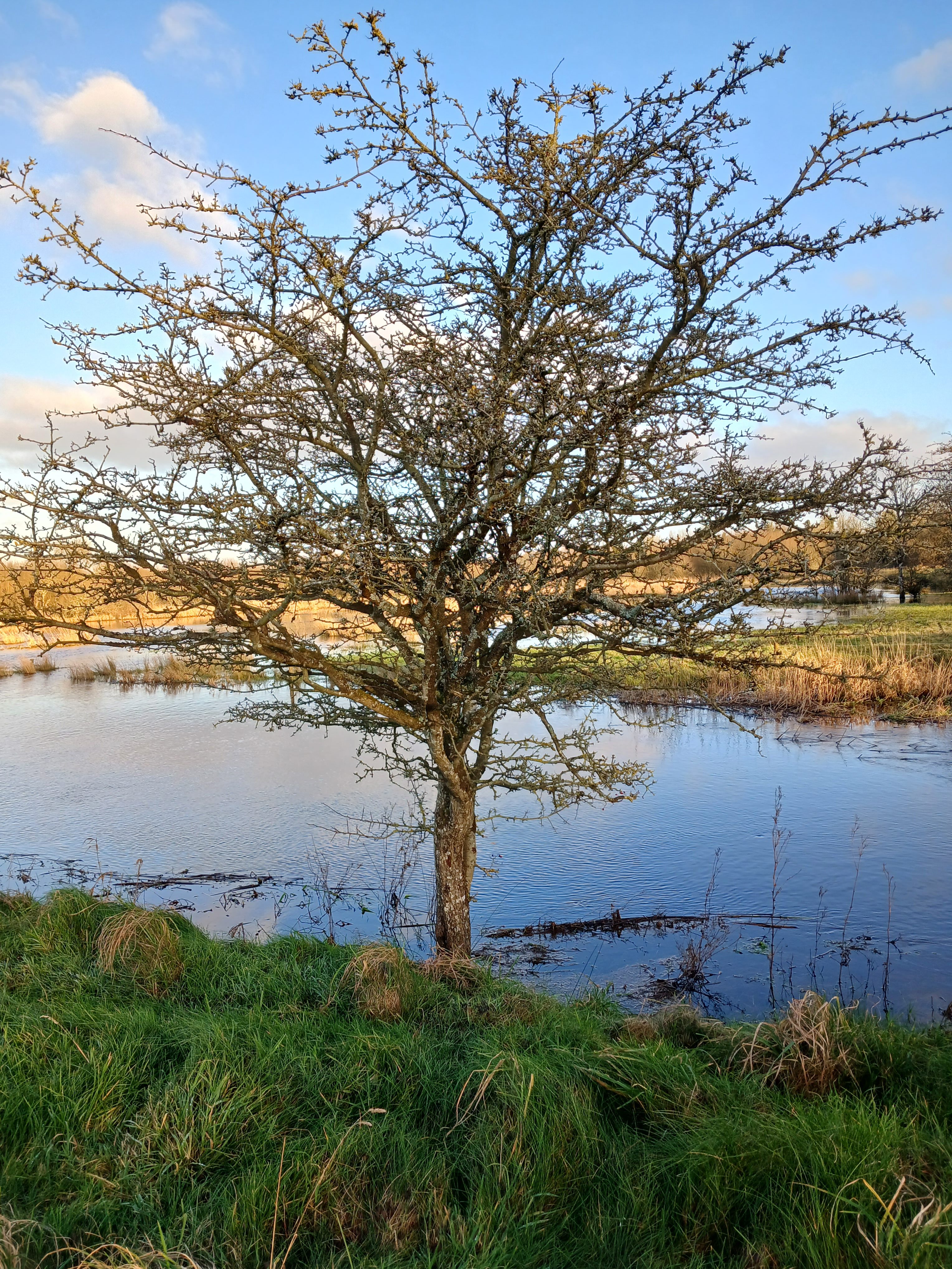 A lone hawthorn tree, which has great significance in Irish folklore, is also a keystone species for biodiversity, supporting 100s of different insects and providing nest sites and food for a variety of birds and small mammals. This one is flourishing in the winter flood plain at Fionnlocha Wild Nature Sanctuary. Wetland habitats like this are increasingly rare and extremely important for many migrating birds and other endangerd creatures.